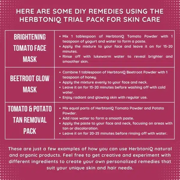 - Trio Combo Pack: Includes tomato, potato, and beetroot powder face packs for glowing skin and tan removal.