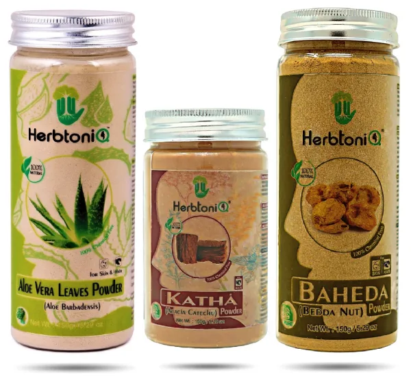 • ✔ NET CONTENT(Pack of 3) : – Aloevera 150gm, Katha 150gm, Baheda 150gm.
