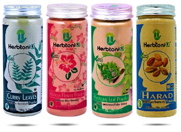 • ✔ NET CONTENT(Pack of 4) : – Curry 150gm, Hibiscus 150gm, Bhringraj 150gm, Harad 150gm.