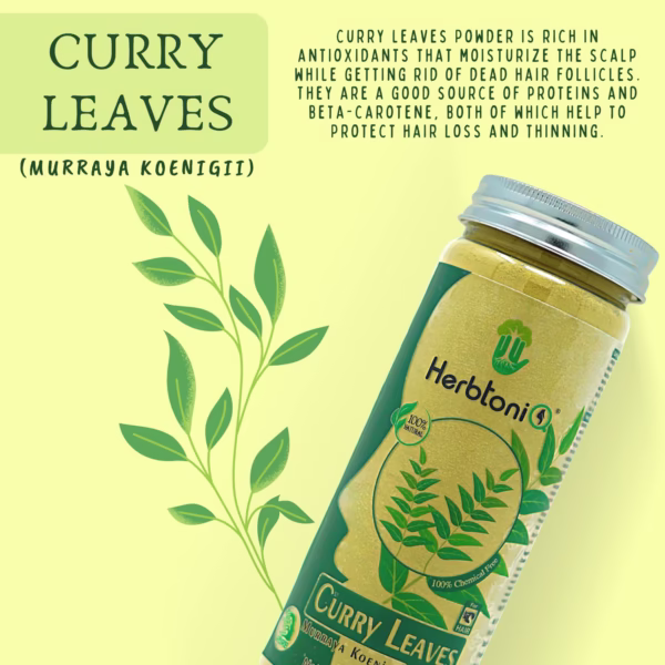 HerbtoniQ Curry Leaves Powder is rich in antioxidants that moisturize the scalp while getting rid of dead hair follicles. They are a good source of proteins and beta-carotene, both of which reduce hair loss and thinning.