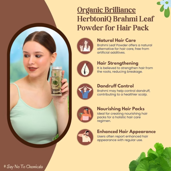 HerbtoniQ Brahmi Leaf Powder is enriched with many bio-chemical compounds such as Brahmine, Herpestine, saponins, alkaloids, Betulic Sour, stimastorol, betasitosterol, bacoside, and bacopasaponins. It is an excellent hair growth promoter. Its regenerative properties help repair hair follicles as well as strengthen the scalp tissue to encourage healthy hair gr’owth. HerbtoniQ Brahmi Leaf Powder also supports scalp circulation which in turn nourishes hair follicles.