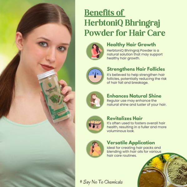 HerbtoniQ Bhringraj Leaf Powder is helpful in following hair conditions like Hair thinning, hair fall, premature greying of hair, scalp itching. It is best known for its proposed hair benefits.