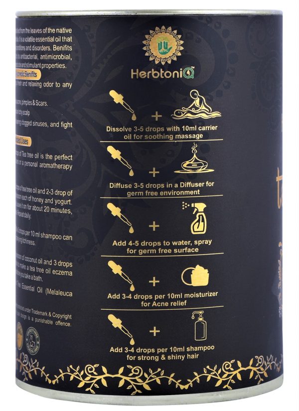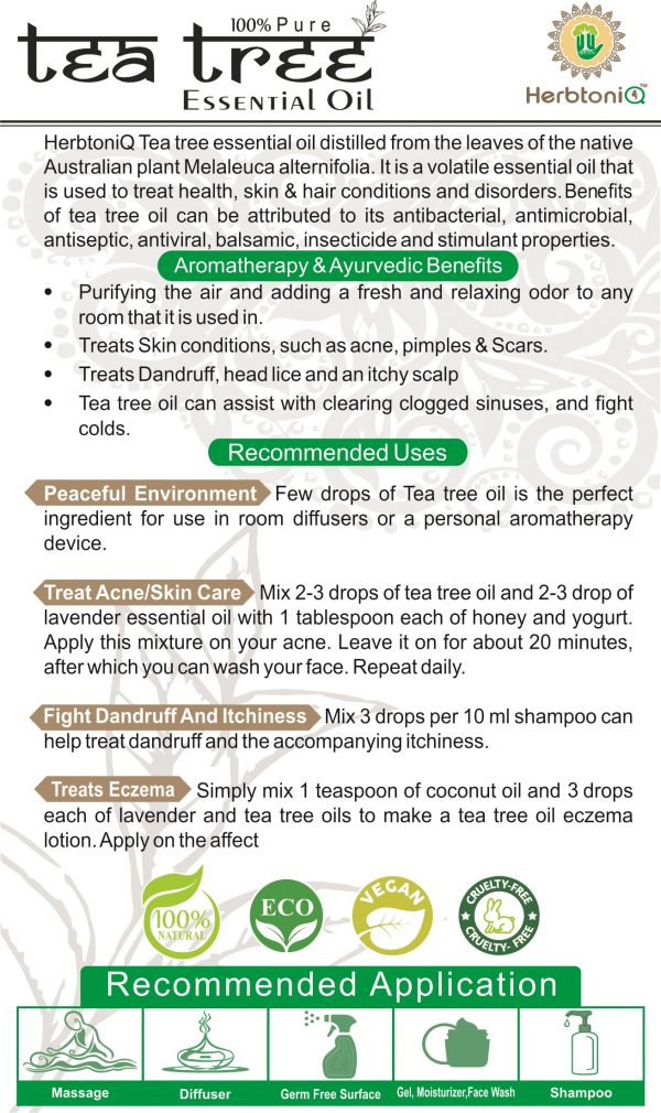 HerbtoniQ Tea tree essential oil distilled from the leaves of the native Australian plant Melaleuca alternifolia. It is a volatile essential oil that is used to treat health, skin & hair conditions and dis-orders. Benefits of tea tree oil can be attributed to its antibacterial, antimicrobial, antiseptic, antiviral, balsamic, insecticide and stimulant properties.